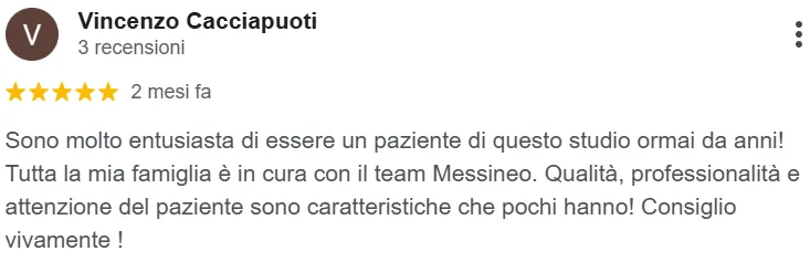 “Sono molto entusiasta di essere un paziente di questo studio ormai da anni! Tutta la mia famiglia è in cura con il team Messineo”