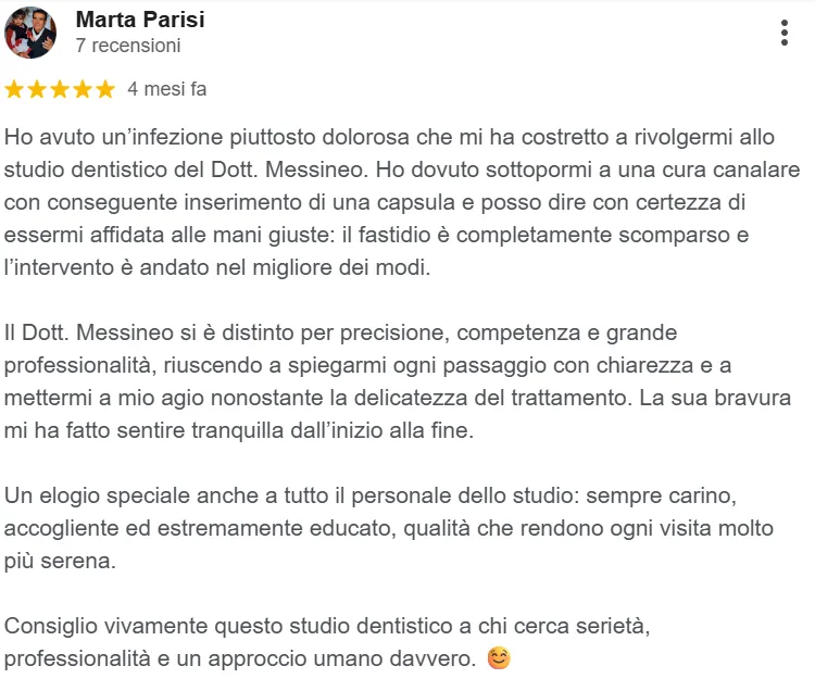 “Ho dovuto sottopormi a una cura canalare con inserimento di una capsula e posso dire con certezza di essermi affidata alle mani giuste”